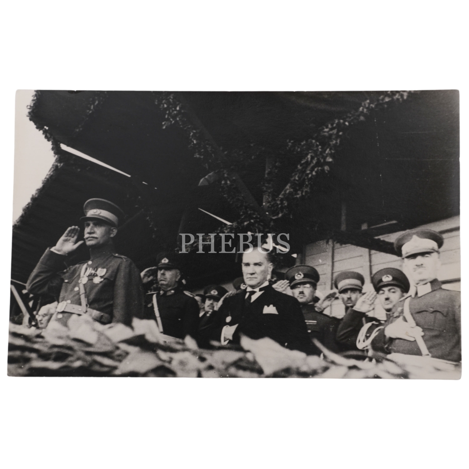 Mustafa Kemal Atatürk, Türkiye´yi ziyaret eden İran Şahı Rıza Pehlevi ile birlikte, Ankara Hipodrom´dan düzenlenen töreni takip ediyor, 17 Haziran 1934, 14x9 cm...