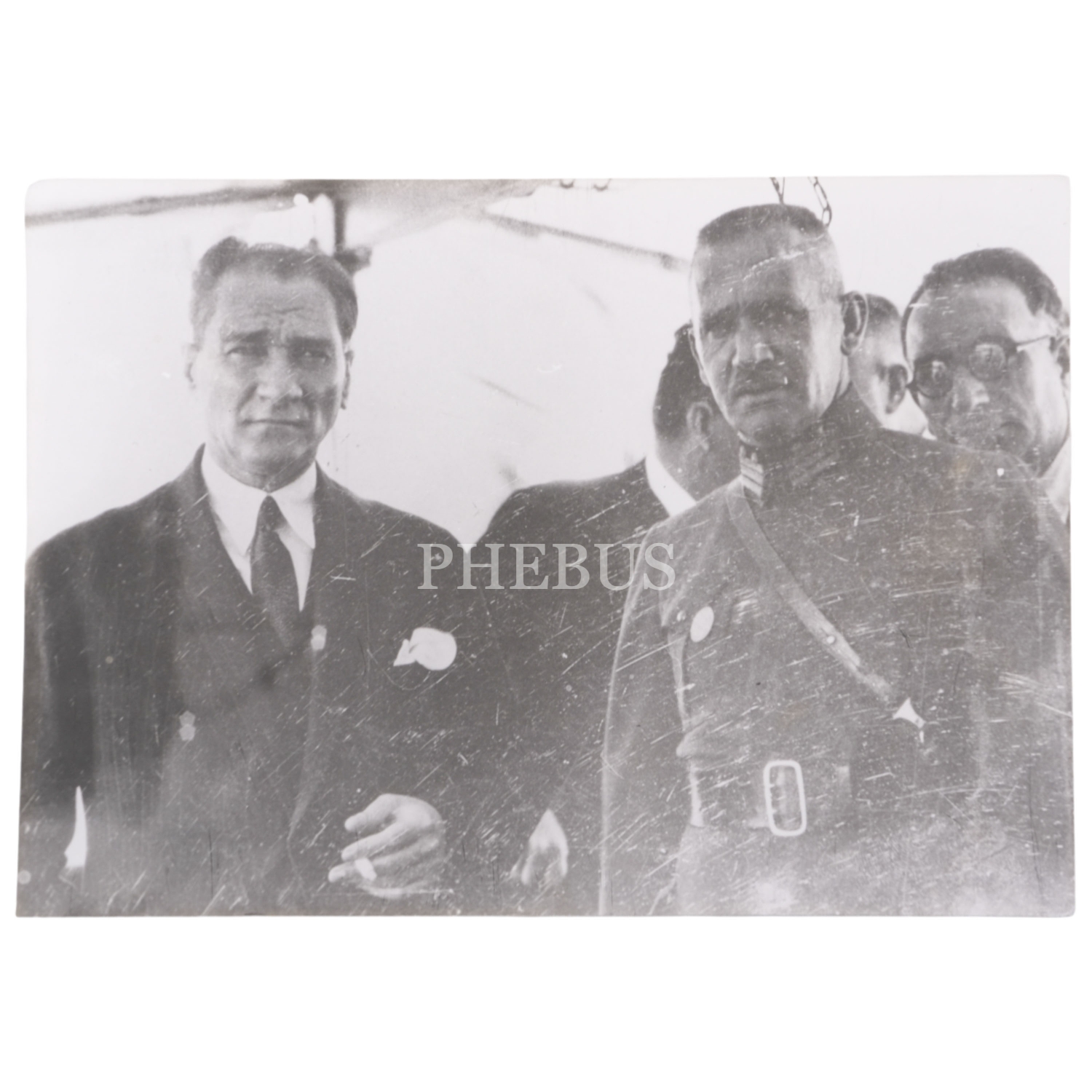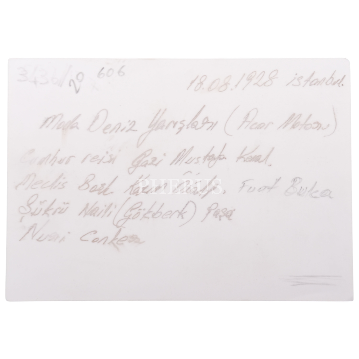 Mustafa Kemal Atatürk, İşgal kuvvetlerinin çekilmesinden sonra Türk ordusuyla İstanbul'a giren ilk kumandan olan Şükrü Naili Paşa ve çocukluk arkadaşı Nuri Conker ile birlikte Moda Deniz Yarışları'nı seyrediyor, 18 Ağustos 1928, 13x9 cm...