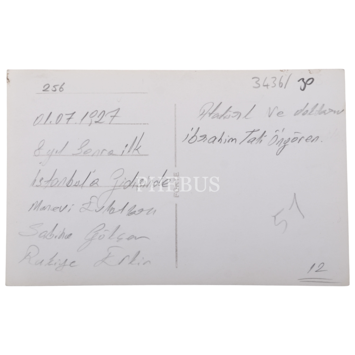 Cumhuriyet döneminde İstanbul’a ilk ziyaretini ancak 1927 yılında gerçekleştirebilen Mustafa Kemal Atatürk, İstanbul´a giriş yaptığı Ertuğrul Yatı´nın güvertesinde, doktoru İbrahim Tali Öngören ve manevi kızları Sabiha Gökçen ve Rukiye Erkin ile birlikte sofrada, 1 Temmuz 1927, 14x9 cm...