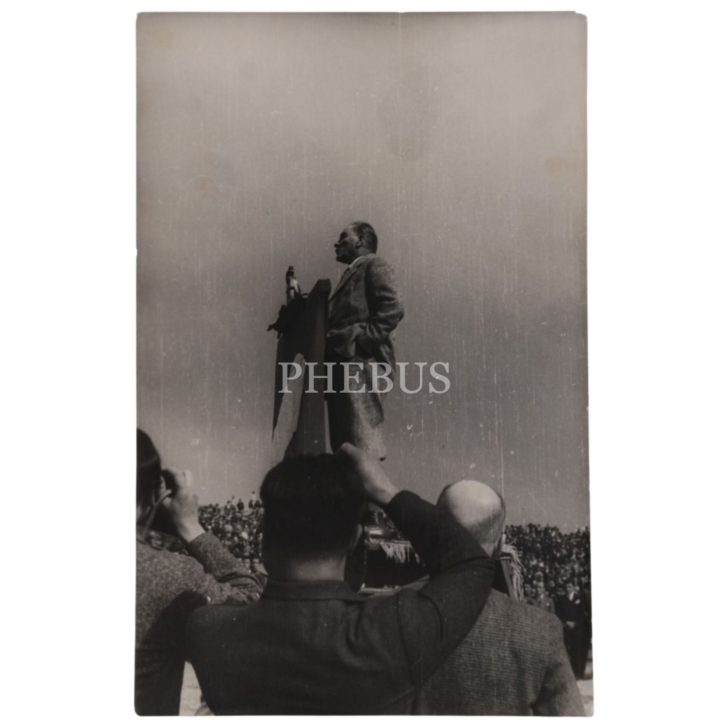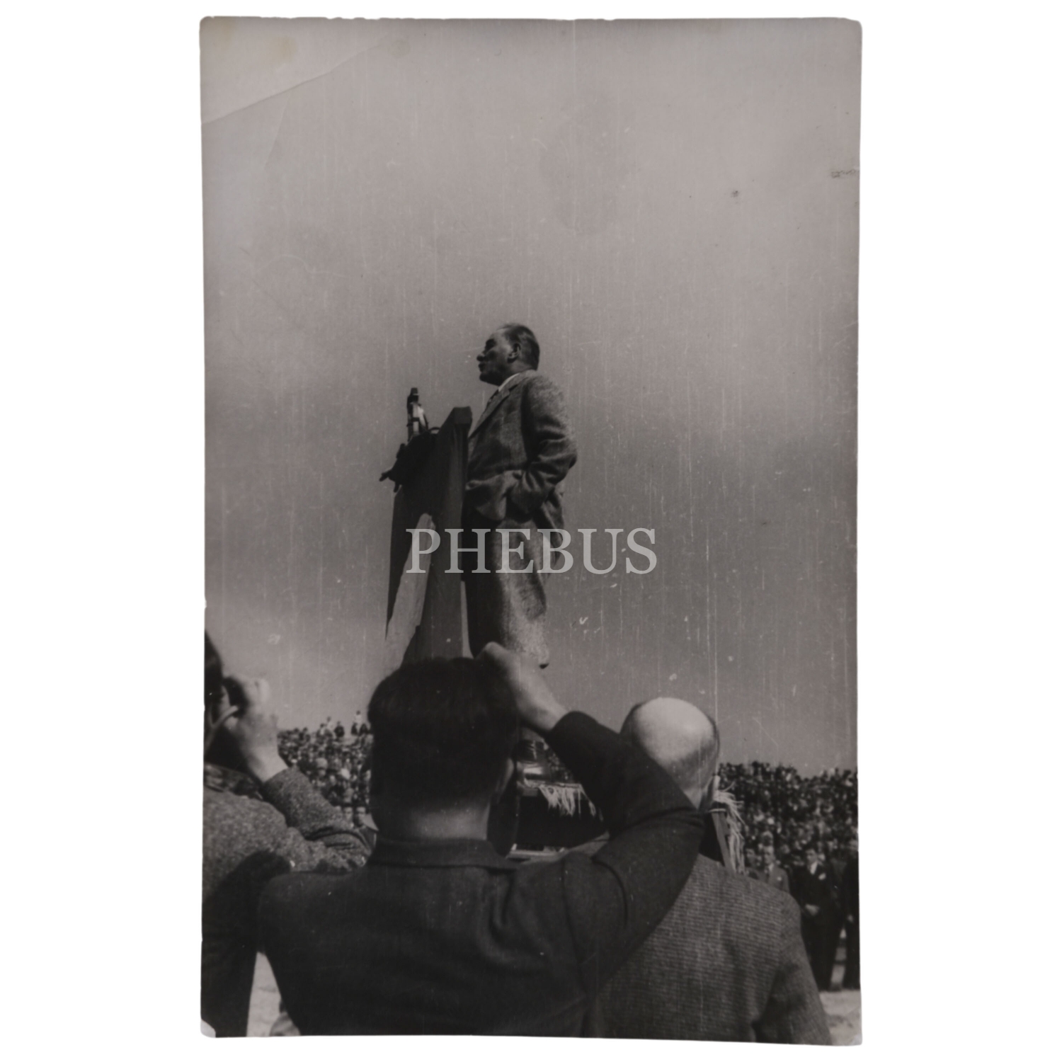 Mustafa Kemal Atatürk, Etimesgut "Türkkuşu" Tesislerinin açılışında, kürsü üzerinden konuşma yaparken, 3 Mayıs 1935, 9x14 cm boyutunda üç adet fotoğraf...