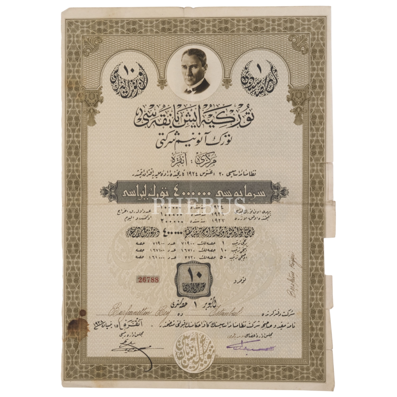 Mustafa Kemal Atatürk görselli, Celal Bayar´dan ıslak imzalı, Burhanettin Bey adına düzenlenmiş Türkiye İş Bankası Türk Anonim Şirketi´nin Osmanlıca hisse senedi, 20x29 cm...